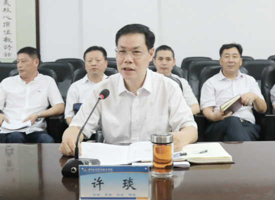 许琰简要介绍了我校建设发展的基本情况,并从“高度重视,认真学习宣传贯彻会议精神”“改革创新,打造高等职业教育新高地”“找标对表,补齐影响学校高质量发展短板”“争先进位,接续书写高职教育奋进之笔”等四个方面,汇报了我校学习宣传贯彻省委十届六次全会暨省委工作会议精神情况。他指出,校党委加强组织领导,深入推进学习贯彻活动落实,通过党委中心组(扩大)先学深学示范学,创新学习载体、线上线下全覆盖等,组织引领全校党员领导干部和全校师生深入学习宣传贯彻省委会议精神。校党委多次组织校内调研、座谈活动,明确了实现学校发展的“十个高质量”建设任务,列出了40项具体发展事项内容;凝练总结了学校发展的16个出彩典型案例。校党委加强党的全面领导,完善党建工作体制机制,强化政治引领和理论武装,创新思想政治工作,激发基层党建活力,从严从实从细深化作风建设,筑牢办好新时代高职教育事业根基;学校坚持创新驱动内涵发展,聚焦“优质校”建设,全面推进教学诊断与改进,深化产教融合、校企合作,加强教学信息化建设,开拓国际交流与合作,深化“专创”融合,实施“三多三精准”学生资助,强化文化育人特色,领航全国水利职业教育改革,实现学校各项事业高质量发展。今后,我校将坚持以习近平新时代中国特色社会主义思想为指导,以建设“国内一流、国际知名”优质高职院校为目标,立足河南,面向全国,依托水利,服务社会,“不忘初心、牢记使命”,奋力实现以学校党的建设高质量推动学校事业发展高质量,办好人民满意的高职教育,以学校的不断出彩助推新时代中原更加出彩。
