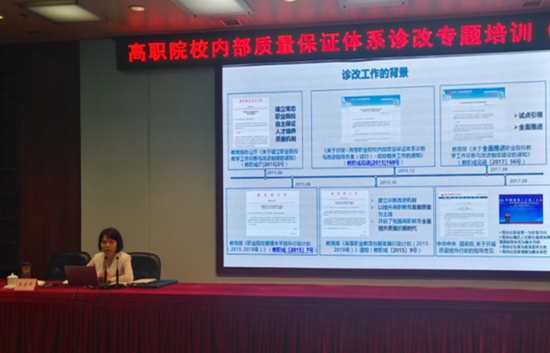 6月26日—30日,第一期高职院校内部质量保证体系诊改专题培训(校长班)在国家教育行政学院举行,来自全国100余名高职院校领导参加了培训。培训主要内容包括职业教育发展趋势分析、诊改制度建设政策解读、诊改实务及院校案例、智能校园建设工作案例等。全国诊改委从全国诊改试点校中选出包括我校在内的3所院校进行院校诊改案例交流。我校副校长焦爱萍应邀参会并作专题报告。