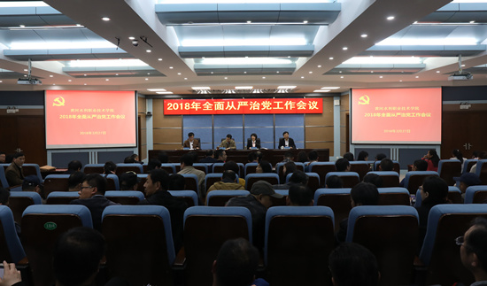 3月27日下午,我校在3号实训馆学术报告厅召开2018年全面从严治党工作会议。全体校领导出席会议,全校科级以上干部,党政办公室、党委组织部、党委宣传部、纪委、审计处、人事处、计划财务处、国有资产管理处、基本建设办公室等部门全体工作人员共200余人参会。会议由校党委副书记、校长祝玉华主持。