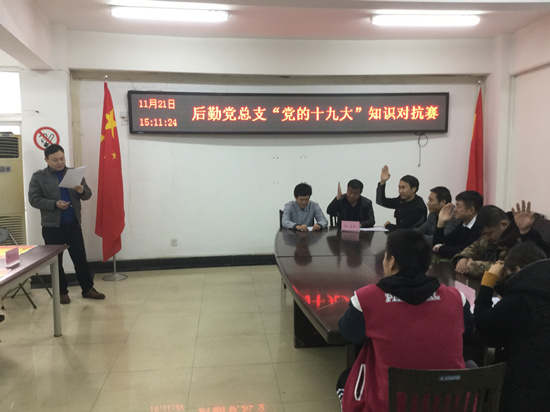 为进一步学习贯彻党的十九大精神,引导和激励后勤服务中心全体党员不忘初心、立足岗位、强化服务、奋发进取,后勤服务中心党总支于11月21日组织开展了学习“党的十九大报告”知识对抗赛。