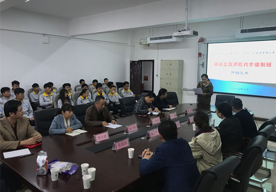 10月25日上午,我校与浙江八方电信有限公司合作开办的现代学徒制“通信工程师学徒班”开班仪式在自动化工程系会议室举行。校质量管理办公室主任丁爱萍,浙江八方电信有限公司项目总监张昊、人力资源经理郦玉琴和项目经理王建柳、张建忠等出席了开班仪式。学徒班31名学生和自动化工程系班子、部分老师参加仪式活动,仪式由自动化工程系主任杜广朝主持。