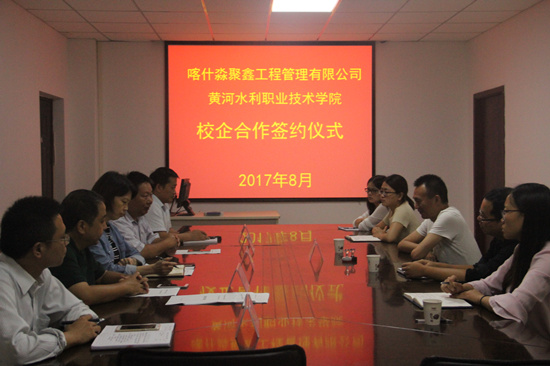8月29日上午,我校与新疆喀什淼聚鑫工程管理有限公司在5号实训馆312室举行校企合作签约仪式。我校副校长焦爱萍、新疆喀什淼聚鑫工程管理有限公司总经理王一凡、水利工程学院负责人及相关人员等参加仪式。