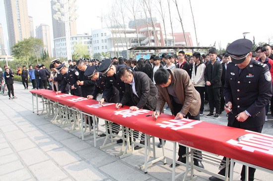 校领导,公安局领导,保卫处、学生处、团委等相关部门负责人和我校广大师生在印有“开展法制宣传教育 构建平安和谐校园 ”的条幅上郑重签名。