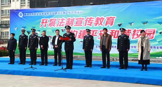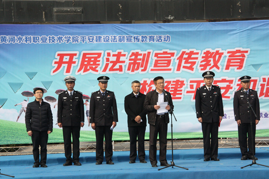 3月28日下午,我校与开封市公安局金耀分局联办的“平安建设法制宣传教育”活动在我校扬帆路举行。我校党委副书记刘卫锋、副校长刘玉宾,开封市公安局副局长刘磊等出席仪式。开封市公安局金耀分局局长张慧勇、学校相关部门负责人、师生代表及民警代表参加了活动。仪式由我校副校长刘玉宾主持。
