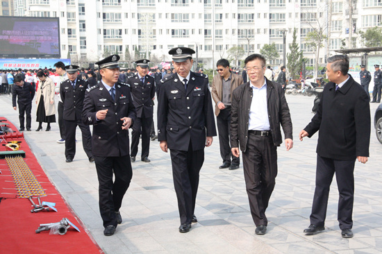 仪式结束后,党委副书记刘卫锋、副校长刘玉宾及保卫处相关人员陪同市公安局领导参观了我校反恐防暴装备和消防器材。