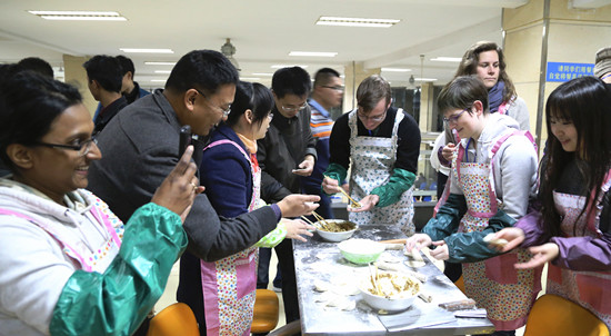 加拿大弗莱明学院客人与我校师生一同包饺子 感受中国饮食文化