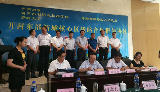 6月30日上午,开封市东部新城核心区战略合作框架协议签订仪式在开封市黄河迎宾馆举行。开封市人民政府副市长张松文,我校副校长杨士恒,河南大学副校长张宝明,开封大学副校长曾小平,祥符区、禹王台区、顺河区及开封市各职能部门的主要负责人出席签字仪式。我校科技处处长王付全代表我校与开封市祥符区政府签订了战略合作框架协议。