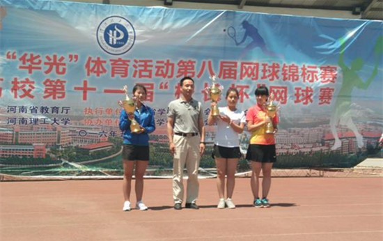 5月11日至16日,河南省大学生“华光”体育活动第八届网球锦标赛在河南理工大学举行。我校网球队在体育部主任刘盎、领队蔡寄平、教练员张亚廷的带领下参加了本届比赛并取得专科甲组男子团体第一名、女子团体第二名,女子单打亚军,女子双打亚军,男子双打亚军,男子单打第三、第八名等一系列优异成绩。这是我校网球队获得的第一个省级体育竞赛男子“团体冠军”,取得了历史性的突破。