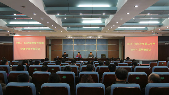 3月16日下午15:00,我校2014-2015年度第二学期全体中层干部会议在3号实训馆学术报告厅召开。全体校院领导出席会议,党委副书记、副校长王卫东主持会议。