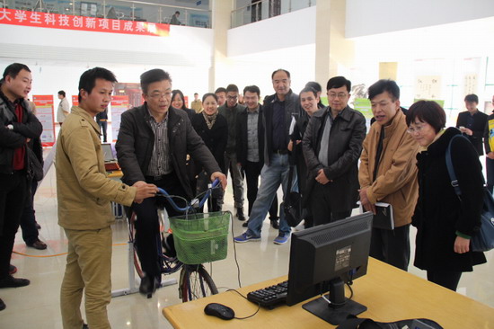 在科技创新展示现场,院长刘国际,副书记、副院长王卫东,副书记刘卫锋及相关部门、各系负责人饶有兴趣地参观成果展,还不断详细询问学生们项目立项时的想法、项目实施过程、收获以及如何深度研发等问题。在智能家居电灯控制系统项目展台前,项目小组的学生向领导们展示了如何利用一部小小的手机,方便快捷地控制房间内的电灯;在虚拟校园漫游系统项目的展台前,刘国际亲自体验了通过3D技术在校园内虚拟漫游的感觉;在健身娱乐自行车控制器项目的展台前,王卫东与项目负责学生交流作品功能及创新,刘卫锋骑上学生们设计的娱乐健身自行车,体验了通过一辆小小的自行车控制游戏中赛车的健身新方式。