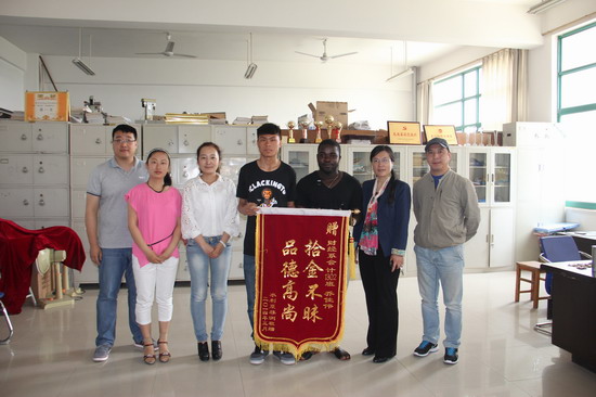 5月9日上午,一面写有“拾金不昧,品德高尚”的锦旗送到了财经系辅导员办公室。送锦旗的是我院非洲班留学生西奥多同学,他连声说:“谢谢捡到我钱包的同学,我没想到还能找到钱包!”