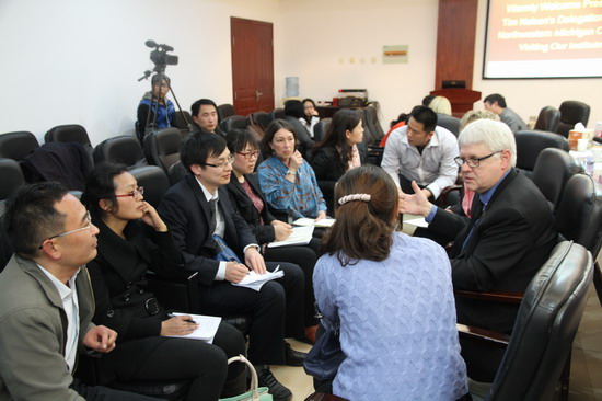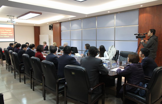 刘国际院长向来宾致欢迎辞,介绍我院的历史概况、办学理念及师资培养、教学科研及国际合作与交流等方面取得的成果,并希望以2012年签署的框架合作协议为基础,深入沟通交流,在更广泛的学科领域寻求合作契机。西北密歇根学院院长Tim Nelson发表讲话,对我院的热情招待表示感谢,并表达了与我院进一步增进友谊、深化合作的美好意愿。