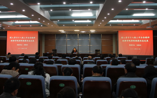 为了更深入学习和贯彻党的十八届三中全会精神,营造浓厚学习氛围,12月11日下午在3号实训馆学术报告厅,院党委书记张惠贞教授以《深入学习十八届三中全会精神 助推学院持续健康快速发展》为题,为科级以上干部作了学习贯彻十八届三中全会精神的专题报告。院领导刘国际、茹正波、王卫东、刘卫锋等出席了报告会。报告会由院纪委书记张豫东主持。
