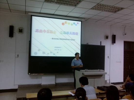 曹建春老师以《路由今日勤奋,交换明天辉煌》为题,为网络专业127名2013级新生做了的一场精彩报告,报告围绕什么是网络、什么是物联网、社会对网络人才的需求、将来我们能干什么及专业培养的目标、任务和新生的任务等七个方面进行了生动翔实的讲解,赢得了学生的阵阵掌声。吴丰老师以《我的大学生活》为题,介绍了军训第一课、学习生活、社团活动、图书馆、职业规划、我要工作了等大学生活诸要素,全方位、多视角为新生介绍了大学生活,帮助新生尽快熟悉、适应大学生活和学习方法,赢得了学生的阵阵喝彩。最后,六名专业导师分片与自己负责指导的学生进行认识、交流与讨论。活动已开展两个小时,师生们依然兴奋的交谈着,意犹未尽。