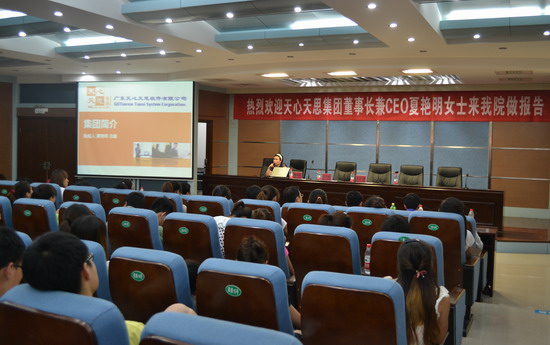 夏艳明女士向师生们讲述了自己刚进入社会时乐观面对困难,自信、果敢处事,一步步走向成功的经历,利用PPT展示及诙谐幽默的言语详细介绍了天心天思软件公司的情况。管理系主任周爱荣感谢夏董事长的精彩报告,希望即将踏入社会的大学生学习夏女士的乐观、自信的人生态度。3个小时报告和交流时间里,夏女士妙语连珠,同学们聚精会神,并积极互动,现场气氛非常热烈。