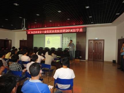 6月7日上午10点,富士康集团郑州科技园区张协理一行5人到我院开展 “2014届订单班学员” 选拔工作,这标志着我院2014届毕业生就业工作拉开了帷幕。副院长刘紫婷、招生就业服务中心主任李纪宾、自动化工程系主任胡健、信息工程系主任丁爱萍等参加了宣讲会。自动化工程系和信息系的300余名学生报名参加选拔。