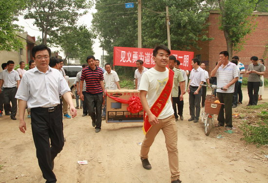 一阵“噼噼啪啪”的喜炮响过,群众高举“见义勇为道德模范邢二朋”的横幅,抬着学院奖励给英雄家庭的42英寸三星液晶电视机步行到邢二朋家。一路走来,村民们个个对邢二朋称赞不已,引以为傲。