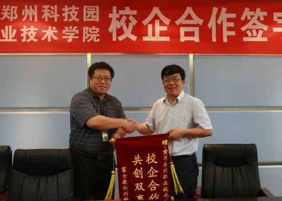 5月24日上午,我院与富士康集团郑州科技工业园校企合作签约仪式在行政楼第二会议室举行。富士康集团郑州科技工业园专理李谦、曾启洋等一行5人,我院院长刘国际、副院长刘紫婷,招生就业服务中心主任李纪宾、副主任商坤,机电系、自动化系、信息工程系、环化系、管理系、外语系等相关系部负责人参加签约仪式。