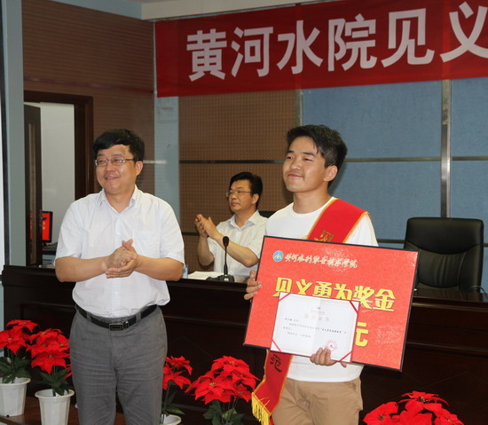 会上,党委副书记、副院长王卫东宣读《黄河水院关于对邢二朋同学见义勇为先进事迹的表彰决定》。决定指出,邢二朋同学在他人生命危急关头,挺身而出、奋不顾身、舍己救人的行为践行了社会主义核心价值观,彰显了中华民族的传统美德,体现了当代大学生的高尚品质,是我院广大师生学习的榜样。为弘扬道德精神,展示道德力量,传递正能量,学院授予邢二朋同学“见义勇为道德模范”荣誉称号,并颁发“见义勇为”奖金10000元。决定向全院师生发出了向邢二朋同学学习的号召。