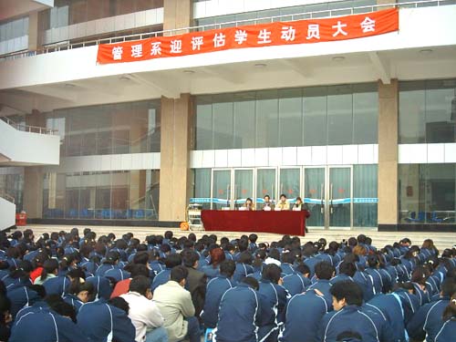 为了使广大同学了解全国人才培养工作水平评估的目的和意义,明确评估的指标体系、内容、方法与过程,提高参与意识,为学院实现评估目标做贡献,3月29日下午,管理系在新校区餐厅前广场召开全体学生迎评估动员大会。系团总支书记李静主持会议,辅导员程云翔、周菲菲、李俊涛出席大会,系党总支书记何聚坤作《立即行动起来,积极主动参与,为学院实现评估目标做贡献》的主题报告。