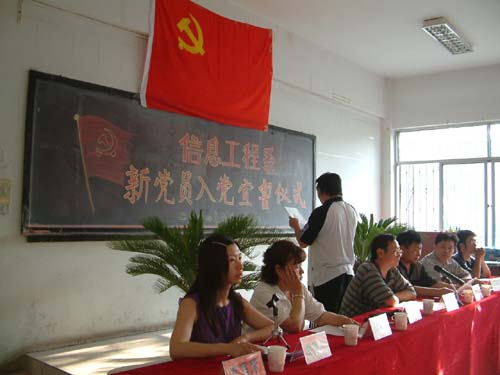 6月28日下午5:00,信息工程系党总支在西北教学楼合堂三举行了庄严的新党员入党宣誓仪式。系党总支书记吕来、系主任朱世同、党总支副书记殷莺、学生党支部书记姜锐以及系全体教工党员、学生党员及部分入党积极分子参加了仪式。