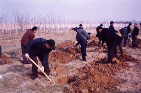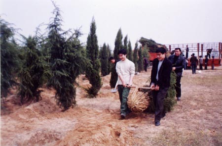 本学期开学后,学院领导研究决定在新校区搞绿化、种苗圃,由后勤服务总公司承担这项工作。接到任务后,后勤服务总公司经理曲新峰及时召开党总支会议,决定总公司自筹资金考察、购置树苗,自己栽种,自己维护。会后,曲总经理带领有关人员先后到鄢陵、潢川等苗圃基地进行了考察。后勤总公司经过多方比较论证,与有关商家签订了协议,并着手安排布置植树工作。