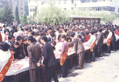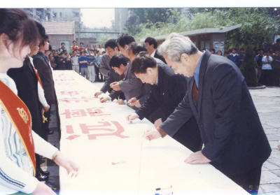 之后,伴着《生命如歌》的歌声,院系领导首先走向长达15米的白色签名条幅,在印有“远离‘非典’,珍爱生命”的条幅上签下自己的姓名,向广大同学表明了他们在抗击“非典”工作中的坚定立场和决心。广大同学更是热情澎湃,激情涌动,争先恐后地在签名条幅上签下了他们坚定地和学院一起努力把抗击“非典”之战抗争到底的承诺。