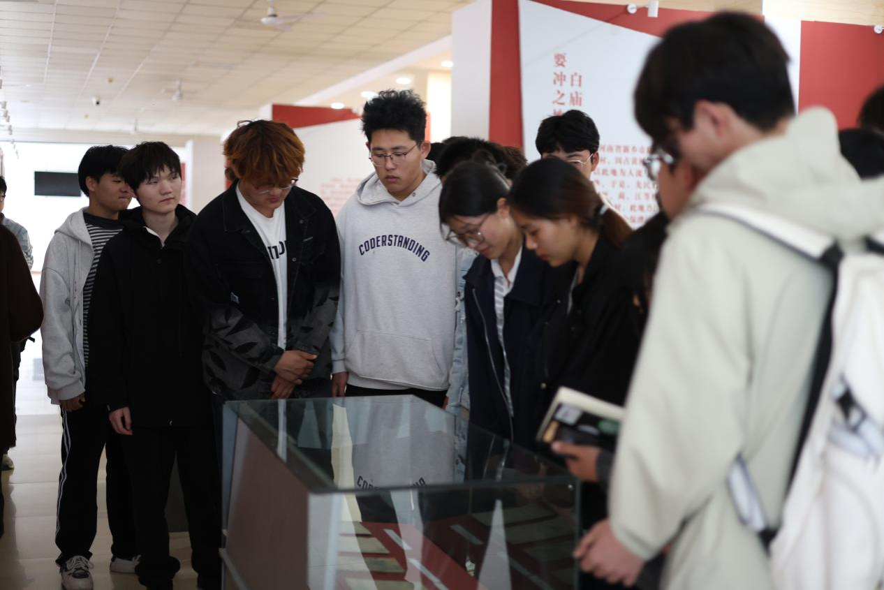 宣誓仪式后,同学们集体前往吴祖泰事迹展览厅参观学习。校团委副书记、红旗渠精神传承者协会指导教师姜璐以馆内历史文物、珍贵图纸为依托,分“求学笃行”“修渠攻坚”“精神永续”三个板块,完整讲述了吴祖泰烈士从勤学精进的青年学子,到以身许国的水利建设者的人生历程。同学们驻足凝视烈士生前手绘的修渠图纸、使用过的测量工具,聆听修渠攻坚故事,深刻感悟烈士“把人民放在心中最高位置”的初心信仰与无私奉献的崇高品格。
