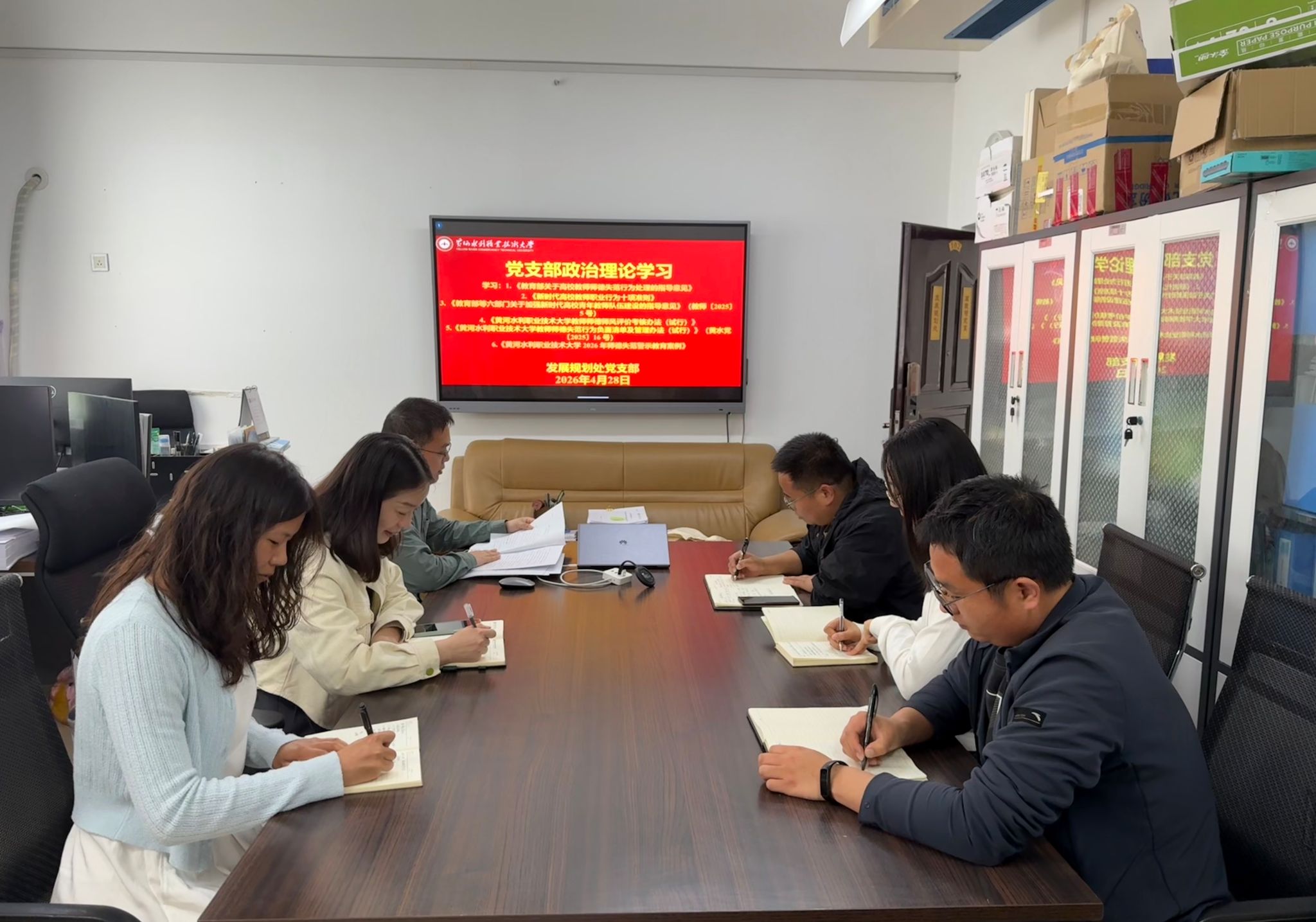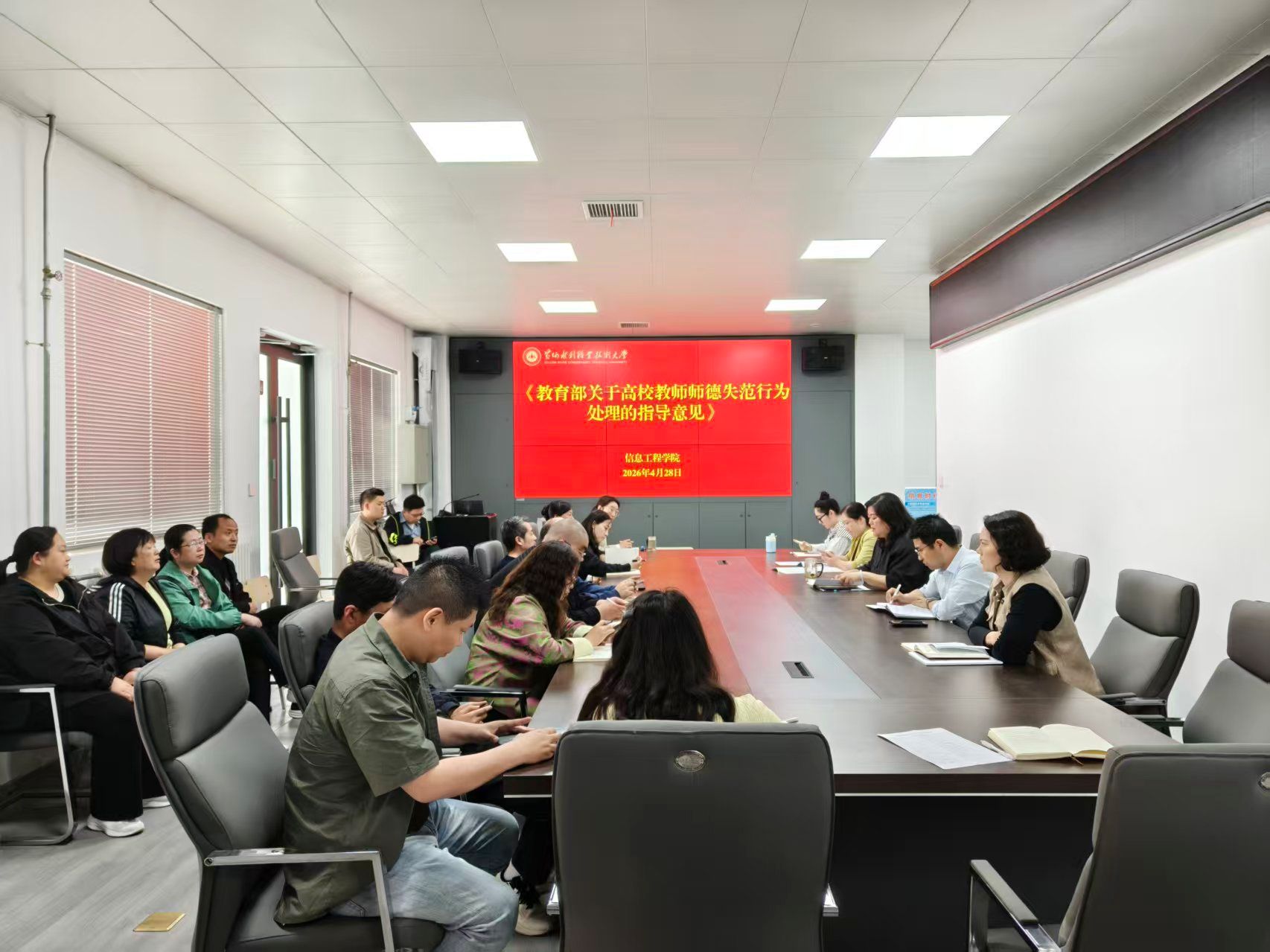 为贯彻落实《黄河水利职业技术大学2026年上半年教职工政治理论学习及思想道德教育计划》学习要求,4月28日,全校各部门、各单位分别组织教职工传达学习《教育部关于高校教师师德失范行为处理的指导意见》《新时代高校教师职业行为十项准则》《教育部等六部门关于加强新时代高校青年教师队伍建设的指导意见》(教师〔2025〕5号)《黄河水利职业技术大学教师师德师风评价考核办法(试行)》《黄河水利职业技术大学教师师德失范行为负面清单及管理办法(试行)》(黄水党〔2025〕16号)《黄河水利职业技术大学2026年师德失范警示教育案例》,引导全校教师规范履职行为,落实立德树人根本任务,弘扬新时代高校教师道德风尚,努力建设有理想信念、有道德情操、有扎实学识、有仁爱之心的高校教师队伍。(供图:各相关部门)