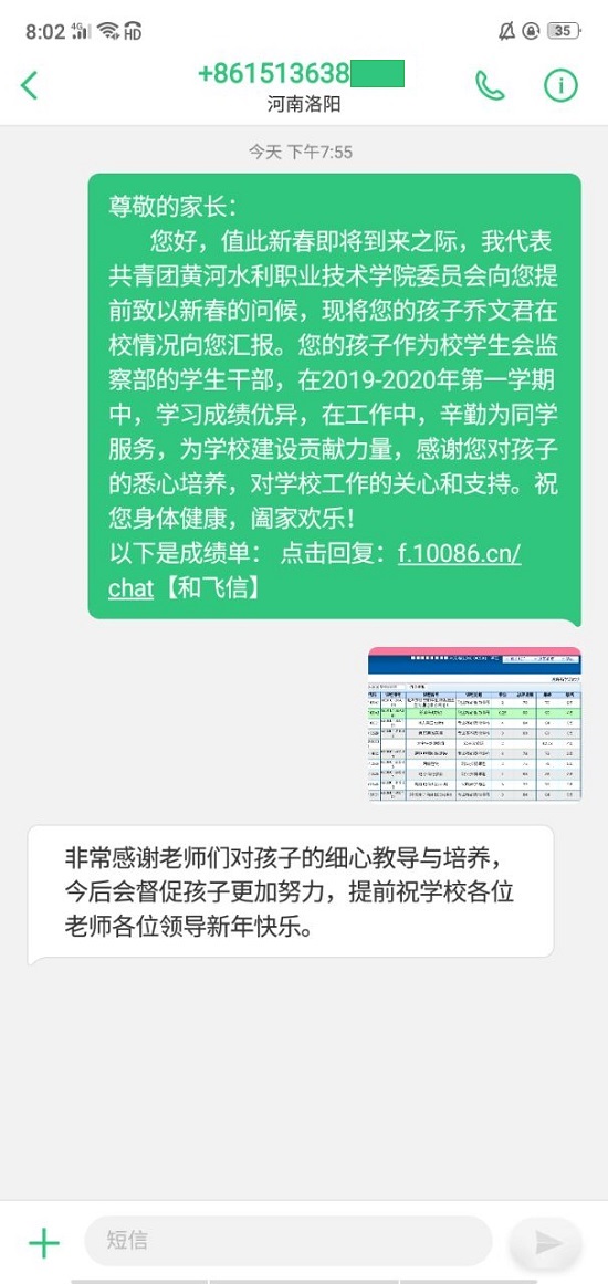“字短情长”的最美成绩单的寥寥数语,包含了老师对学生干部辛勤工作的肯定,加强了学校和家长之间的沟通和交流。此次“最美成绩单”活动受到了广大学生家长的认可,家长们纷纷回复短信,表达对学校的感谢,感谢学校对孩子的关心和教导。