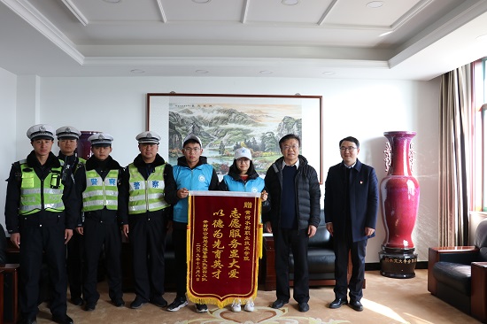 12月10日上午,开封市公安局交警大队第四大队一行人为我校送来了印有“志愿服务显大爱 以德为先育英才”字样的锦旗,我校党委副书记刘卫锋、校团委负责人以及部分志愿者参加了赠送仪式。