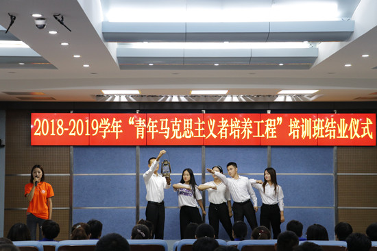 仪式在激扬青春的团歌中拉开序幕。团委副书记郝黎闻对学员们提出要求,要坚定理想信念,加强理论素养,做一名马克思主义的坚定拥护者;勤奋刻苦学习,坚持知行合一,做一名马克思主义的勇于实践者;争当先锋模范,甘于奉献社会,做一名马克思主义的积极传播者。团委副书记耿风宣读“2018-2019学年“青年马克思主义者培养工程”培训班优秀学员名单及结业学员名单”。各位老师为优秀学员及结业学员代表颁发证书。优秀学员代表环境工程学院学生张文涛分享学习心得,表示通过学习,提高了理论水平、创新能力、组织协调能力和实践能力,更加坚定自身对马克思主义的信仰,注重理论学习与社会实践相结合,珍惜同学间的珍贵情谊。