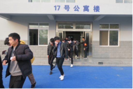 11月22日下午,我校组织开展校园消防疏散逃生演练活动。土木与交通工程学院师生代表200余人参加了活动。活动在17号学生公寓楼展开。在消防科方增勇老师就活动中的注意事项、逃生技巧等方面内容对师生进行了简单培训后,活动正式开始。逃生演练假设学校17号公寓楼内发生火灾,楼层冒起了滚滚浓烟,二层200余名师生被困,在引导员指挥下,师生用湿毛巾捂住口鼻,快速、有序地按照指定路线撤离学生公寓。全体参演师生在整个过程中态度认真、动作迅速,全部人员在3分钟内均撤离至安全区域。