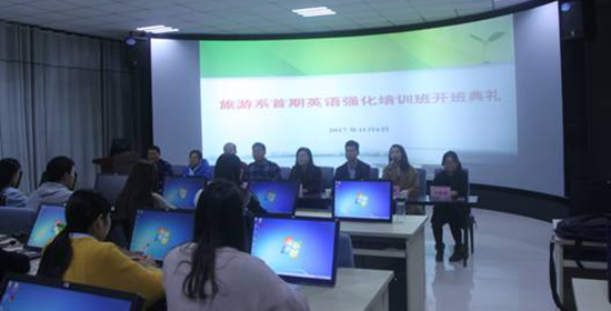 为提高学生英语口语水平,进一步提升职业竞争力,11月6日晚,旅游系在SY5102教室举行首期英语强化培训班开班典礼。国际教育学院院长陶永霞,旅游系主任焦红强、党总支书记樊建科,部分专业教师及旅游系2016级酒店管理专业、旅游管理专业的34名优秀学生参加了此次活动。
