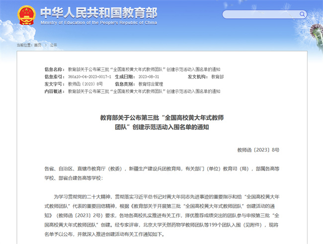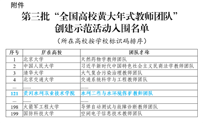 本网讯 近日,教育部公布了第三批全国高校黄大年式教师团队创建示范活动入围名单的通知,黄河水利职业技术学院水利工程与水环境保护教师团队成功入选第三批全国高校黄大年式教师团队,全国高职院校仅30所入围。从首批到第三批,该校共有2支团队获批全国高校黄大年式教师团队。截止目前,拥有2支全国黄大年教师团队的高职院校全国仅有4所,该校为其中之一,也是河南省高职唯一、水利高职院校唯一。