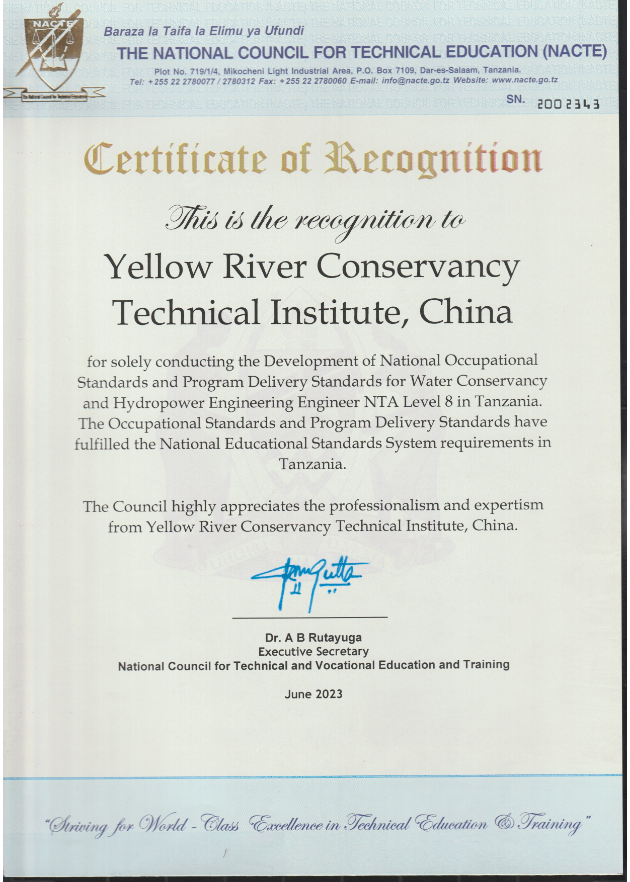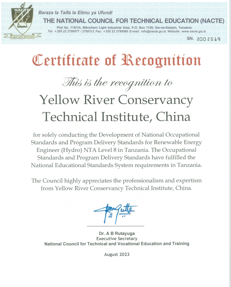 9月1日,记者从黄河水利职业技术学院了解到,继水利水电工程技术(水利水电施工技术)专业通过坦桑尼亚国家职业教育委员会审核,纳入该国职业教育体系后,近日,黄河水利职业技术学院水电站设备安装与管理专业开发的新能源工程师(水力)NTA8级(最高等级)职业标准和配套的专业教学标准,顺利通过坦桑尼亚国家职业教育委员会审核,并正式纳入该国国家职业教育体系。