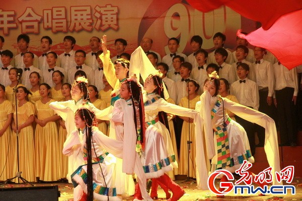 合唱展演分缅怀、歌颂、展望三个乐章。《映山红》、《东方红》、《太行山上》、《十送红军》等一首首红色经典歌曲中将师生的思绪带回了激情澎湃、斗志昂扬的革命岁月。《唱支山歌给党听》、《我和我的祖国》、《我们走在大路上》再现了中国共产党带领勤劳、勇敢、智慧的中国人民建设社会主义的豪迈之情。《国家》、《天路》、《我爱祖国的蓝天》,抒发了对党的无限深情,歌颂了党的丰功伟绩,进一步坚定了永远跟党走的信念。院长刘国际、副院长刘紫婷领唱的《旗帜更鲜艳》,将整场晚会推向高潮,观众热情高涨,掌声与欢呼声此起彼伏。