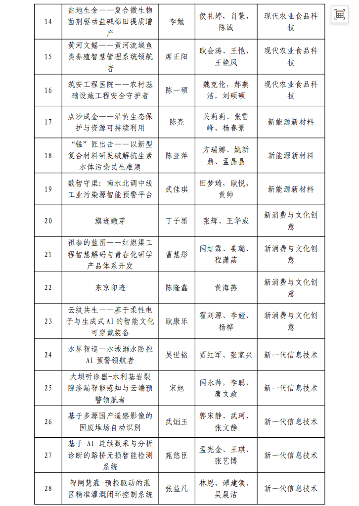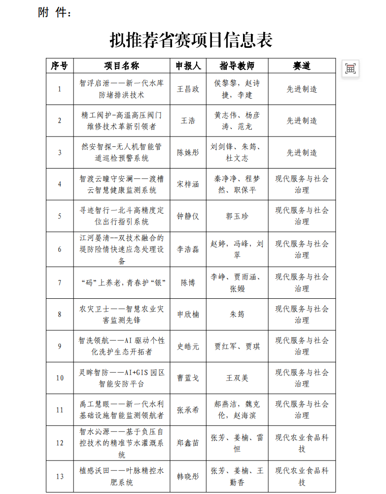 黄河水利职业技术大学2026年“挑战杯”拟推荐省赛项目信息公示