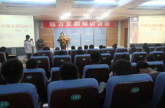 张淑华老师为大家讲解了京剧的发展历史、艺术特点,着重讲述了中国京剧“四大名旦”不同的演唱风格:梅兰芳的表演庄重深邃、气势非凡,简洁凝练而艺压群芳;尚小云的表演神完气足、明快俏丽,美媚柔脆和文戏武唱为特点;程砚秋的表演以文武昆乱无不精湛的艺术造诣而赢得观众;荀慧生的表演无论唱、念、做、打,均在细微之处见神韵,“四大名旦”的艺术特点在张淑华老师的讲座中娓娓道来,把在座师生们带入到了一个充满魅力的京剧世界。为使师生对京剧艺术有更深的了解,她还穿插为大家播放了四位艺术家的演出的视频《贵妃醉酒》等片断,令喜爱京剧的师生们看得如醉如痴。当播放到她参加第五届“和平杯”参赛剧目《锁麟囊》“春秋亭外风雨暴….”唱段视频时,迎来师生一阵热烈的掌声。