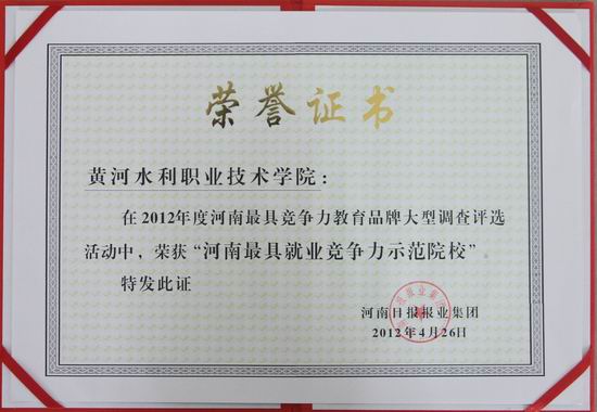 426上午,在郑州召开的“2012河南最具竞争力教育品牌”调查评选揭晓颁奖典礼暨第三届(中部)教育发展高端研讨会上,我院获评为“2012年度河南最具就业竞争力示范院校”。