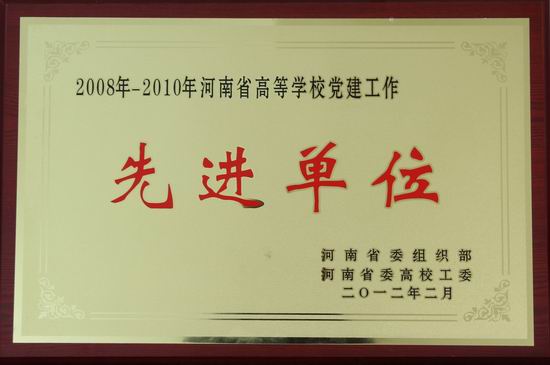 2月13日,从第二十次全省高校党的建设工作会议上获悉,我院以优异成绩通过省高校党建工作评估,并荣获“2008年-2010年河南省高等学校党建工作先进单位”,受到省委组织部、省委高校工委的联合表彰。