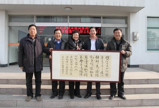 赵民众是我院知名校友,1974年10月至1976年6月在黄河水利学校测量专业学习;1978年2月到黄河水利委员会工作;1995年4月至2011年任河南黄河河务局副局长、党组成员;现任河南河务局巡视员。他在书法艺术方面具有较深的造诣和研究,现为黄河书法家协会主席。他对母校怀有深厚的感情,一直以来都十分关心黄河水院的建设和发展,此次希望通过赠送自己的书画作品表达对母校的眷恋之情,并祝福学院事业蒸蒸日上。我院张惠贞书记代表学院对河南河务局长期以来关心支持黄河水院的发展表示感谢,希望赵巡视员和刘局长今后“常回家看看”,继续加强与黄河水院的联系。