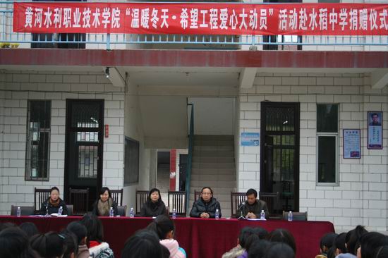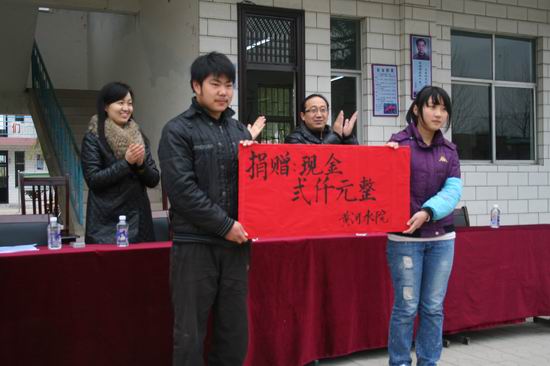 瑟瑟寒风挡不住暖暖情意,1124日,在院团委带领下,我院青年志愿者来到开封市金明区水稻中学,开展了2011“温暖冬天·希望工程爱心大动员”捐赠活动。开封市金明区教文体局总支书记吉瑞君,我院团委书记周志琦、副书记谷献晖,水稻中学校长赵新立、校团委书记秦艳花参加了捐赠仪式。