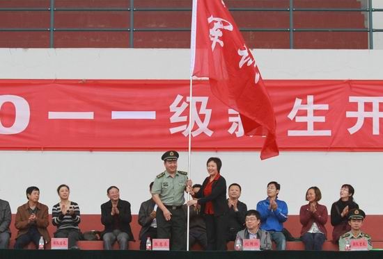 党委书记张惠贞向军训团首长授团旗,正式开始了我院2011级新生为期10天的军事训练工作。