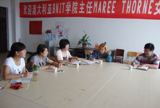 近日,澳大利亚布里斯班北部科技学院(BNIT)教学部主任Maree Thorne女士来我院,就中澳合作项目教学质量进行评估,并就合作专业教学与我院科研外事处处长张春满、外语系副主任王爱琴、涉外秘书徐锐及专业课教师进行了座谈。