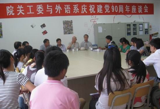 为庆祝中国共产党建党90周年,进一步提高外语系师生的思想政治觉悟,应外语系直属党支部的邀请,621日下午,我院关工委黄新、白济民、郑乃明、来作华、葛长雄、刘玉宗等离退休老领导、老教师与外语系师生同聚一堂,回顾党的历史,缅怀党的先驱,歌颂党的伟大功绩。参加座谈会的还有院离退休工作处书记陈广先、外语系主任王爱琴、书记樊建科、分团委书记王成伟等。
