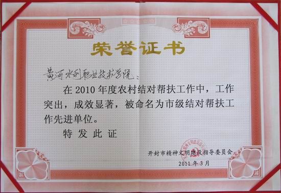 日前,开封市精神文明建设指导委员会下发文件(汴文明[2011]4号),我院在文明单位结对帮扶工作评比中,荣获“开封市文明单位结对帮扶工作先进单位”称号。