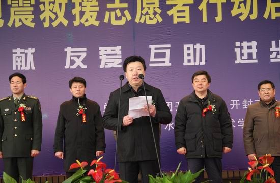 1月9日下午,由开封市人民政府、共青团开封市委、开封市地震局和我院联合主办的“开封市地震救援志愿者行动启动仪式”在风雨球场隆重举行。中国地震局党组成员、副局长修济刚,河南省地震局党组书记、局长梁宪章,中国地震局人事教育司副司长吴仕仲,河南省地震局党组成员、副局长卢国合、开封市人大常委会副主任任文生、开封市人民政府副市长王学杰、开封军分区副司令员张中华、共青团开封市委书记程杨、我院党委副书记王卫东等领导出席仪式。会议由开封市人民政府副秘书长梁东雁主持。