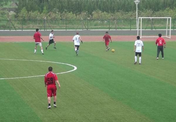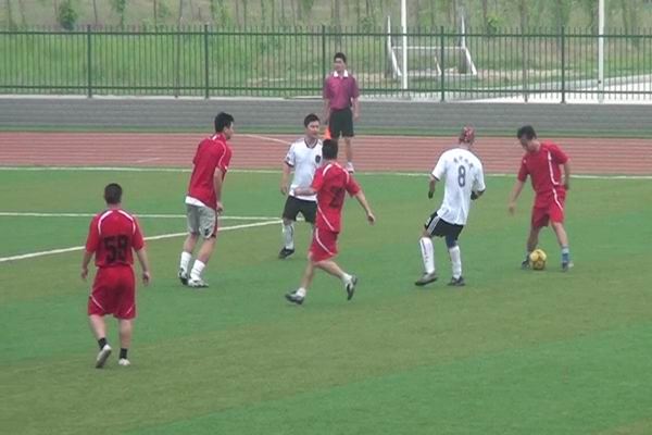 上午9:30分,比赛一开始,场上顿时沸腾了起来。已成立10年的河南农大队凭借良好的技术和丰富的经验,向我院教工队发起冲击。我院教工队毫不示弱,以默契的配合和充沛的体力,迅速调整到最好状态进行比赛,加强防守,积极反攻,并由我院队员张志峰在对方点球点附近扫射攻入一球,可惜被判越位在先。随后对方打出精彩配合,攻入一球。上半场结束时,河南农大队1:0暂时领先。