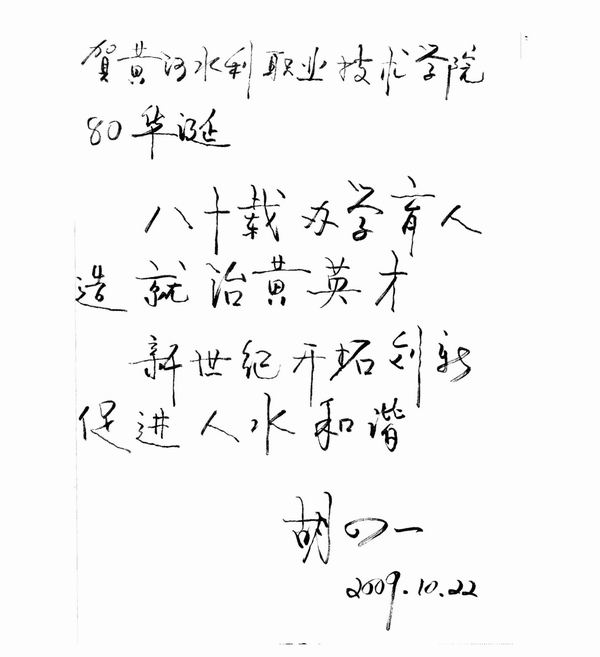 水利部原党组成员、中国水利教育协会会长周保志为学院校庆题词
